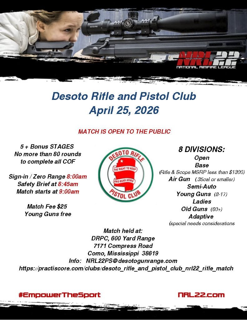 Apr 25 DRPC NRL22 Match 8:00 am - 1:00 pm Desoto Rifle & Pistol Club 7171 Compress Road , Como , MS Event Details Get Directions