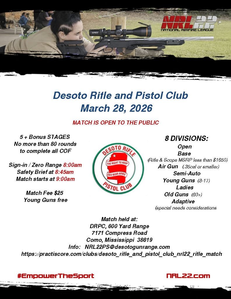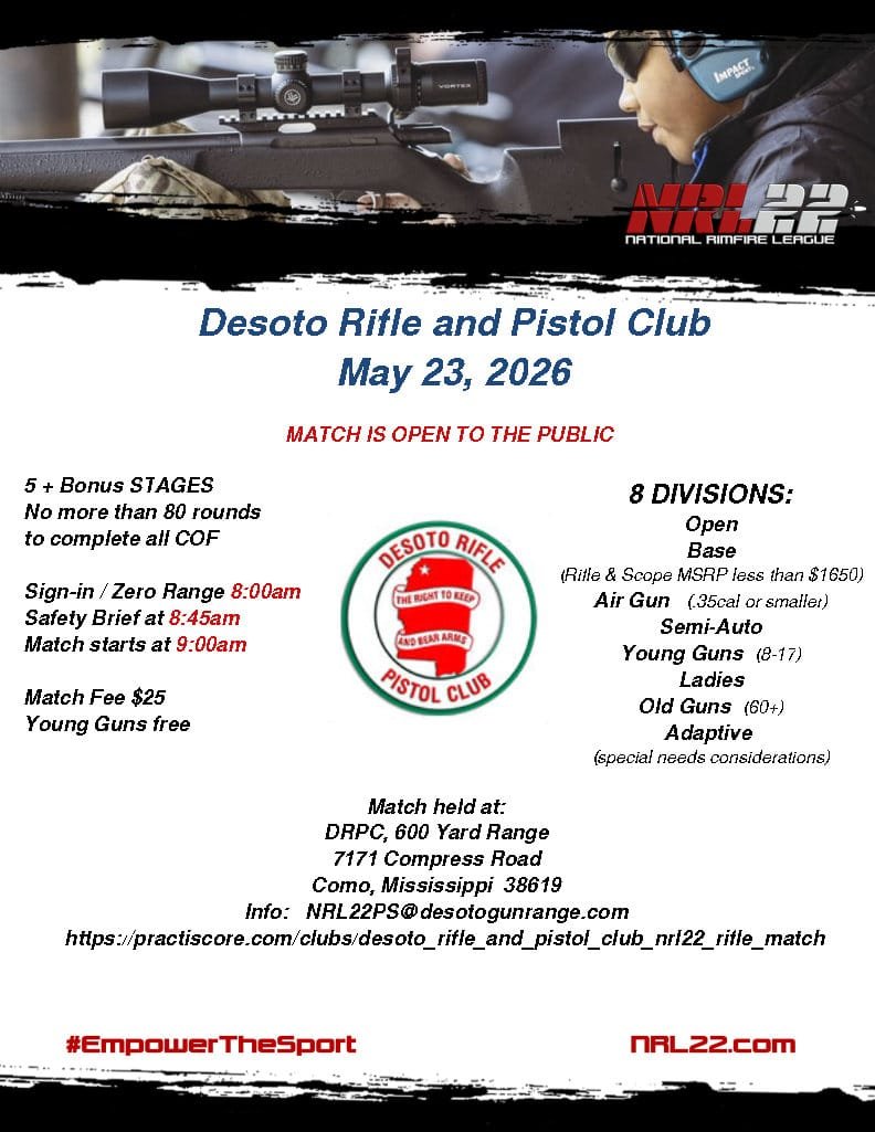 Mar 28 DRPC NRL22 Match 8:00 am - 1:00 pm Desoto Rifle & Pistol Club 7171 Compress Road , Como , MS Event Details Get Directions